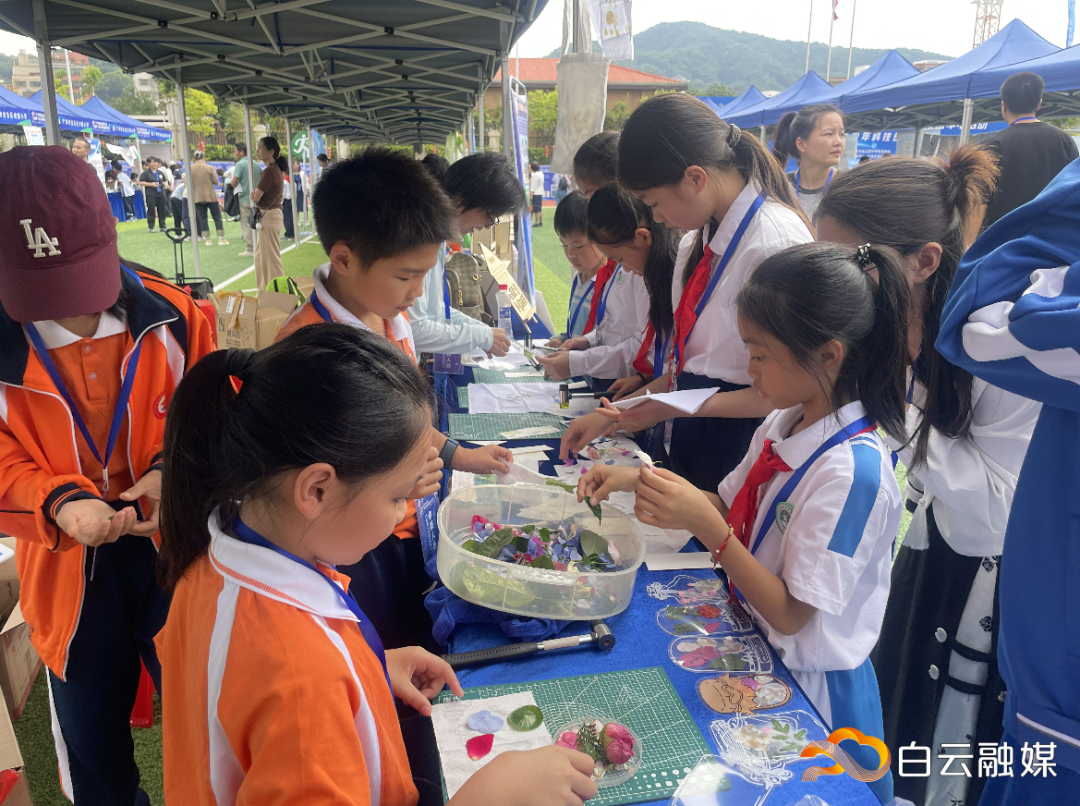 在白云区潭岗小学展位,非遗植物拓染项目同样吸引了众多中小学生参与。一把锤子、适量明矾,加上校园内的枯叶、落花,就能DIY成一份原创品。随着“咚咚咚”的敲打声,植物的颜色和纹理渗透到了扇子、布袋上,一幅幅独特的植物拓染作品便完成了。该校科学老师李宝仪介绍,在实践过程中,同学们不仅能了解植物品类和科学原理,还能通过捶打释放压力,学生还可将作品赠与好友,获得成就感。
